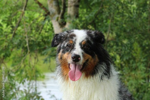 © Grafikdesign Rädler, Fototapeta premium Australian Shepherd sitting on grass closeup