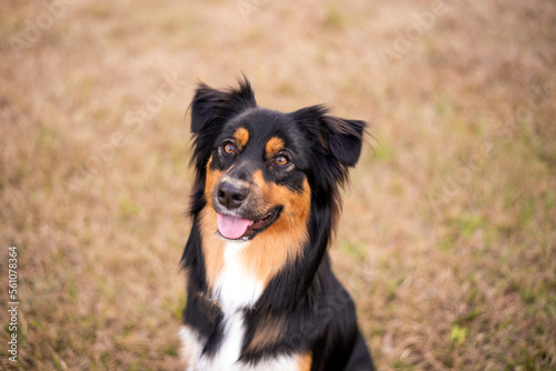 © Tanya, Fototapeta premium Australian Shepherd Tri Color Aussie outside at a park.