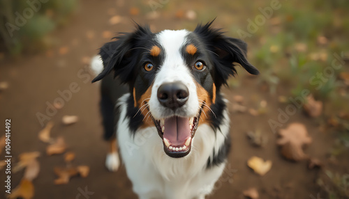 Fototapeta premium Australian Shepherd with happy expression outdoors in sunlight
