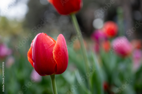 Obraz premium Australian spring time tulip blooming in spring. bright tulip flower field. summer field of flowers. gardening and floristics. nature beauty and freshness
