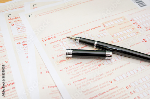 © Tania, Obraz premium Australian tax forms with a pen. Financial document. Tax time. Close-up.