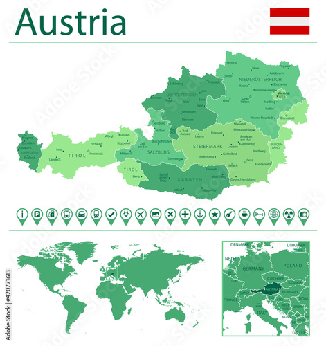 Obraz premium Austria detailed map and flag. Austria on world map.