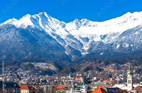 Fototapeta premium Austria, Tyrol, panoramic wiew over Innsbruck and Inn valley with the snowy mountains in the background