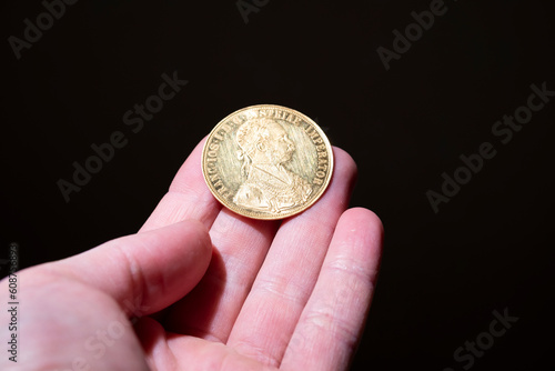 © Alexander LW, Fototapeta premium Austrian four ducats on US dollars. Investments in investment coins. The concept of buying gold. investment in gold.