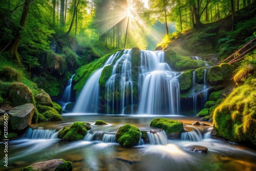 © Autun, Obraz premium Austrian Klamm's emerald cascade, a tilt-shift long exposure captures the serene green forest landscape.