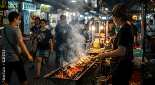 Obraz premium Authentic Asian Street Food Vendor Grilling Skewers at Night Market Lively...