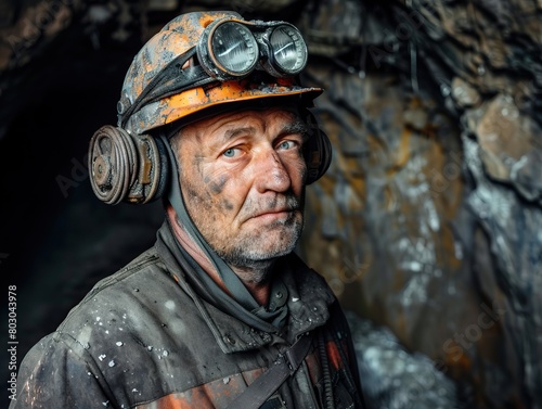 © Veronika, Fototapeta premium Authentic image of a miner working in a dark coal mine environment