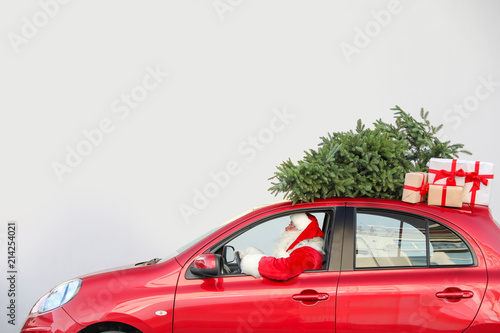 Naklejka premium Authentic Santa Claus driving red car with gift boxes and Christmas tree,...