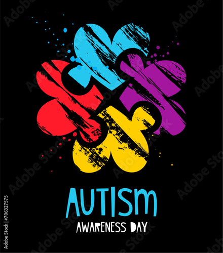 Obraz premium Autism Awareness Day. Cool lettering. Pieces of a colored puzzle in the form of hearts from brush strokes.