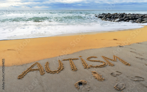© Lahiru, Fototapeta premium Autism word written on beach sand with child footprints. Awareness day concept.
