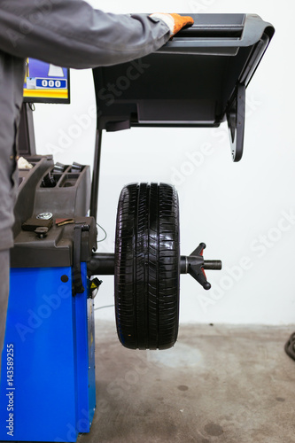Fototapeta premium Auto mechanic repairing car. Selective focus on wheel.