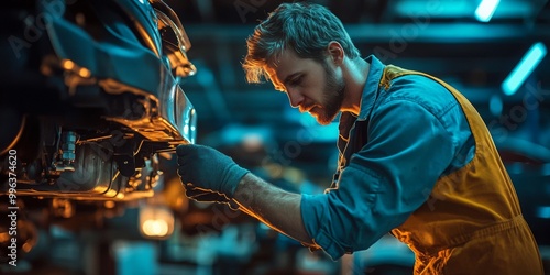 © paisorn, Obraz premium Auto Mechanic Repairing Exhaust System in Dimly Lit Workshop, Focused Atmosphere, Blurred Background Enhancing Intensity of Work