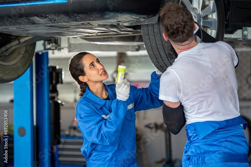 Obraz premium auto two professional mechanical technician garage motor car engine team...