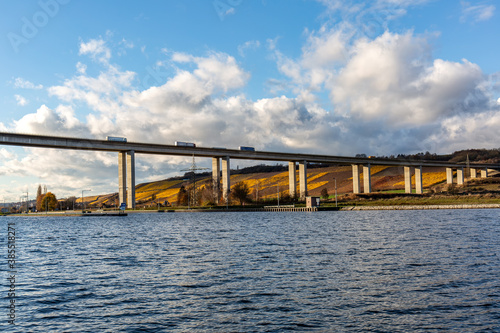 © haenson, Obraz premium Autobahnbrücke der A7 über dem Main zwischen Marktbreit und Frickenhausen im Herbst. Im Hintergrund Weinberg
