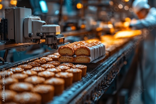 © Tyrah, Fototapeta premium Automated Bakery Production Line with Cookies on Conveyor Belt