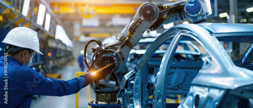Fototapeta premium Automated Car Manufacturing: A skilled worker in a modern factory oversees a robotic arm welding a car frame.