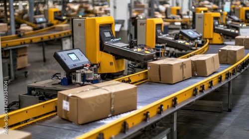 Naklejka premium Automated conveyor system transporting packaged goods in a modern...