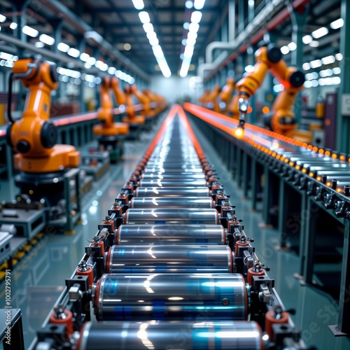 © LIDIIA, Fototapeta premium Automated Factory. An industrial setting with rows of orange robotic arms along a production line, with metal cylinders on a conveyor belt.