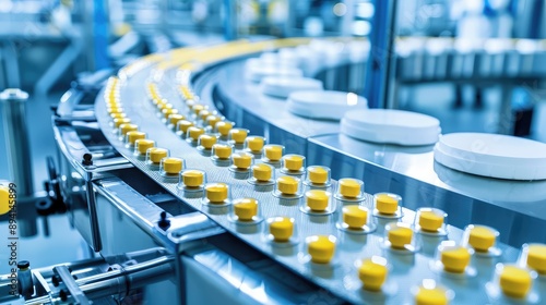 © raining, Obraz premium Automated Factory Assembly Line with Yellow Bottle Caps