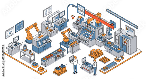 © Maureen, Obraz premium Automated factory production line vector illustration for technology design in isometric style