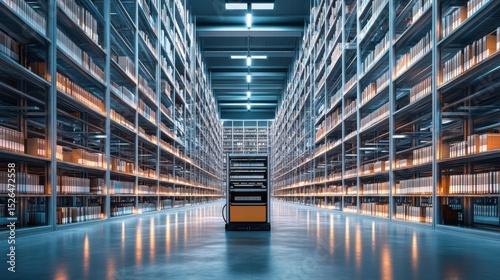 © Tanya, Fototapeta premium Automated guided vehicle navigating warehouse shelves at night