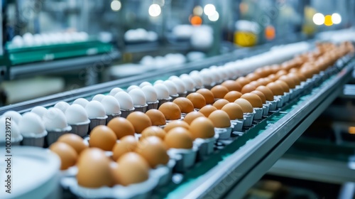 Obraz premium Automated packaging line of chicken eggs in a factory, emphasizing efficiency...