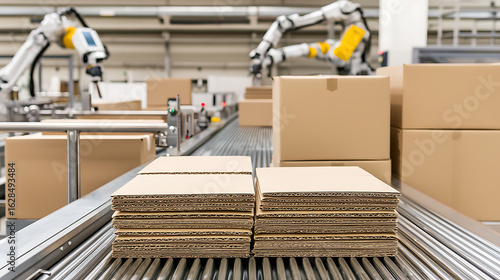 Naklejka premium Automated Packaging: Robot arms assist with cardboard box assembly line for efficient production. Conveyor belts transport materials in a clean, modern factory.