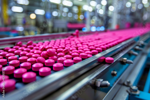 Obraz premium Automated Production Line with Pink Tablets in Pharmaceutical Factory