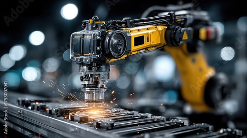 © niramol, Fototapeta premium Automated Robotic Arm Welding Metal with Sparks in Factory Setting