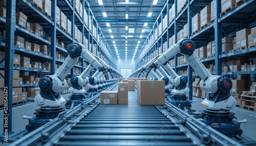 © Saravuth, Fototapeta premium Automated robotics operations modern warehouse industrial technology inside high-tech environment