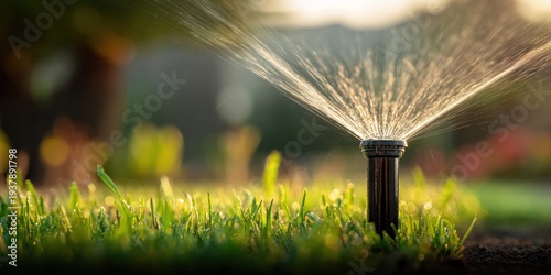 Fototapeta premium Automated sprinkler system watering lush green grass with sparkling water droplets at sunrise