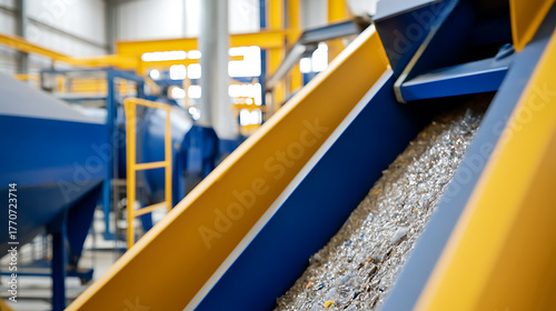 Naklejka premium Automated system on recycle center moving recyclable materials along a conveyor belt. Inside industrial setting showing machinery, and processes focused on resource recovery and sustainability.