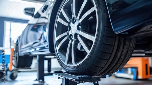 © Sampao, Fototapeta premium Automated tire balancing system ensuring perfect alignment on high-performance wheels.
