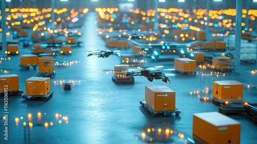 © Suroart, Obraz premium Automated warehouse; drones deliver packages.