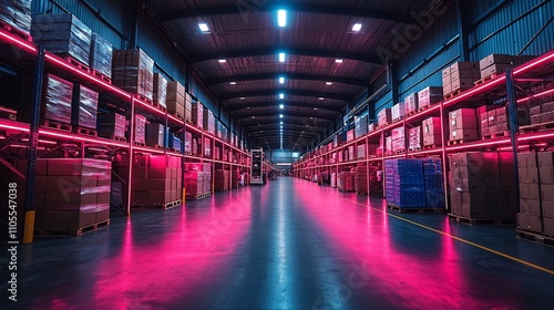 Fototapeta premium Automated Warehouse with Neon Lit Robotic Logistics and Supply Chain Monitoring
