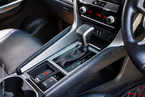 © Muanpare, Fototapeta premium automatic transmission shift selector in the car interior. Closeup a manual shift of modern car gear shifter. 4x4 gear shift