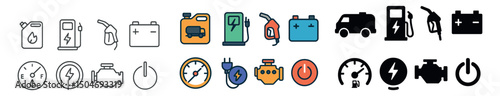 Fototapeta premium Automotive and fuel icon collection: outline, filled and colored vehicle symbols