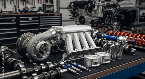 © MUHAMMADADIALFARIS, Fototapeta premium Automotive engine components displayed on a workbench in a workshop.