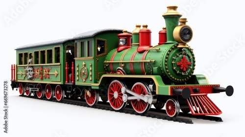 © Sandris_ua, Fototapeta premium Automotive: Vibrant Green Christmas Train with Red Wheels Chugging Forward on White Background