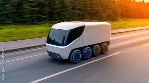 © Kanimalia, Fototapeta premium Autonomous Electric Delivery Truck Driving on a Scenic Highway at Sunset