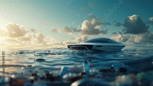 Obraz premium Autonomous electric ships cleaning ocean plastic pollution