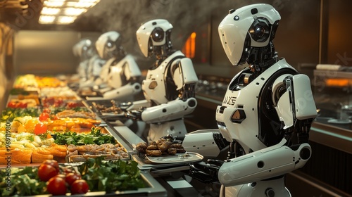 Fototapeta premium Autonomous food preparation robots in restaurants: Robotic chefs cooking and serving meals.