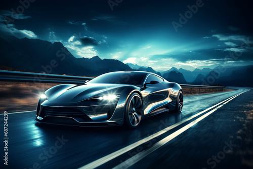 Fototapeta premium Autonomous Self-Driving Car Moving Through Highway with light trails