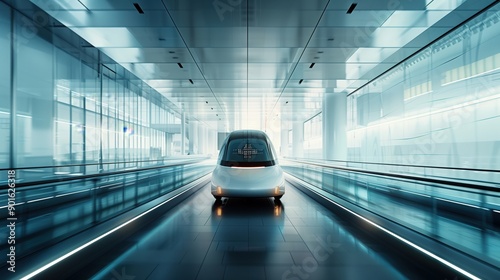 Fototapeta premium Autonomous shuttle with a minimalist design, featuring a holographic passenger interface, navigating through a futuristic airport. The shuttle represents the future of automated and efficient