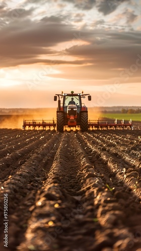 © Bussakon, Fototapeta premium Autonomous Tractor Plowing Fields at Sunset with Precision Agricultural Technology