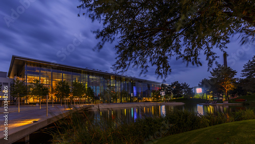 © Ines Radke, Obraz premium Autostadt Wolfsburg – ZeitHaus und Parklandschaft bei Abendlicht