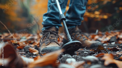 Obraz premium Autumn adventure metal detecting enthusiast searching for treasures in a...