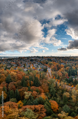 Obraz premium Autumn Aerial View Of Burnaby Neighborhoods And Colorful Forests In Greater...