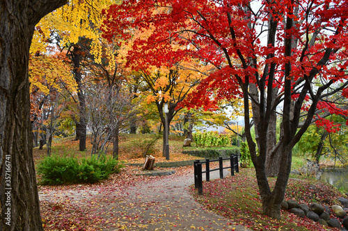 © Magnetu, Naklejka premium Autumn and foliage nature background. Beautiful landscape in the garden, Hiking Walk path in colorful vivid foliage of trees, Peaceful, calm and relaxing atmosphere. Eco tourism travel concept.