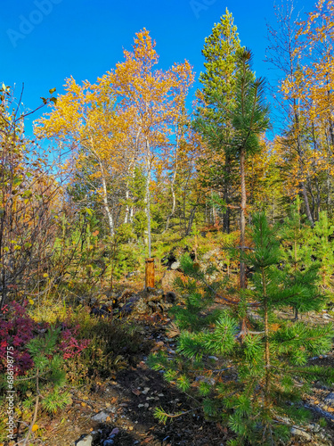 © Виктория Балобанова, Fototapeta premium Autumn Arctic landscape in the Khibiny mountains. Kirovsk, Kola Peninsula, Polar Russia. Autumn colorful forest in the Arctic, Mountain hikes and adventures.